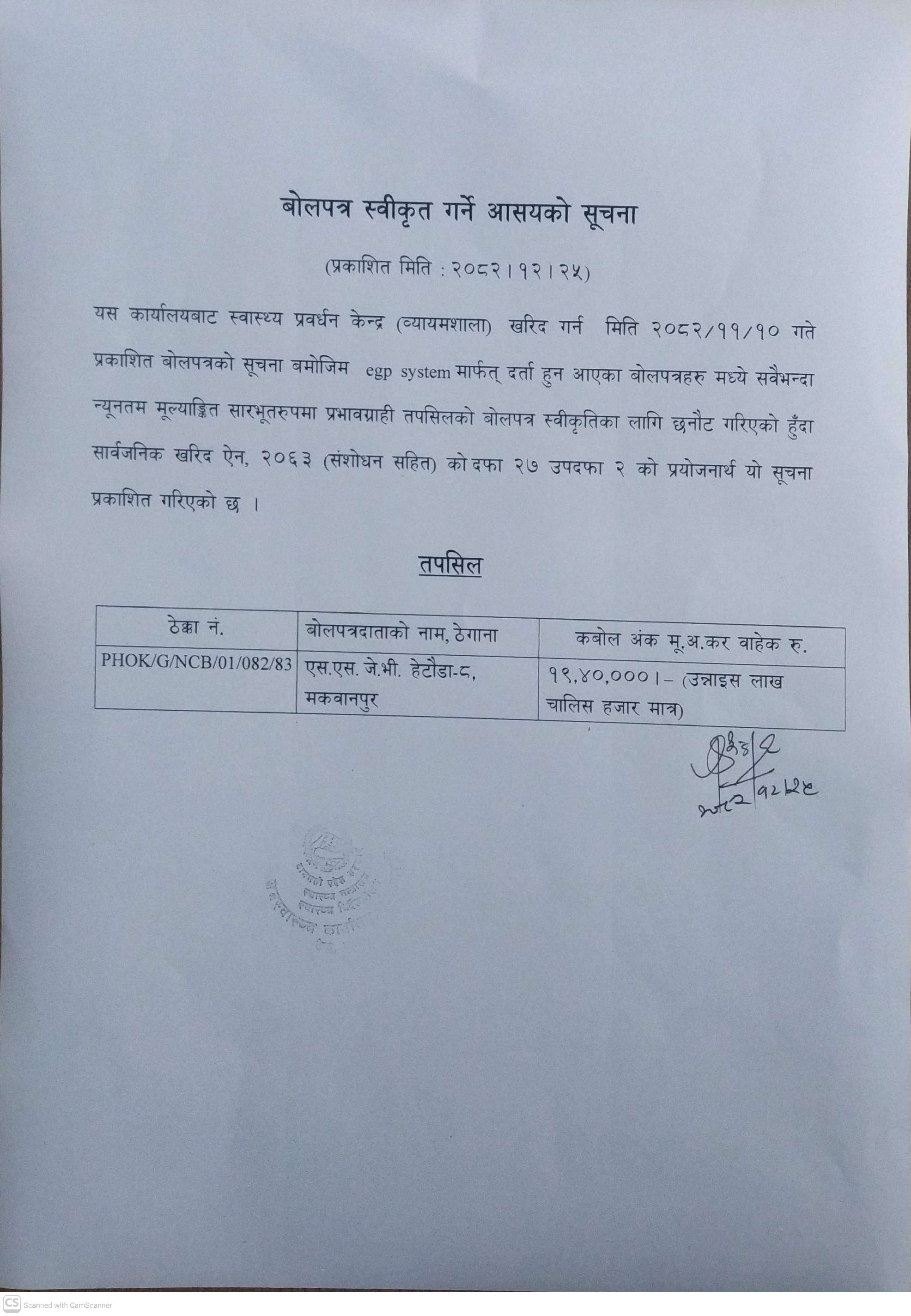 बोलपत्र स्वीकृत गर्ने आसयको सूचना